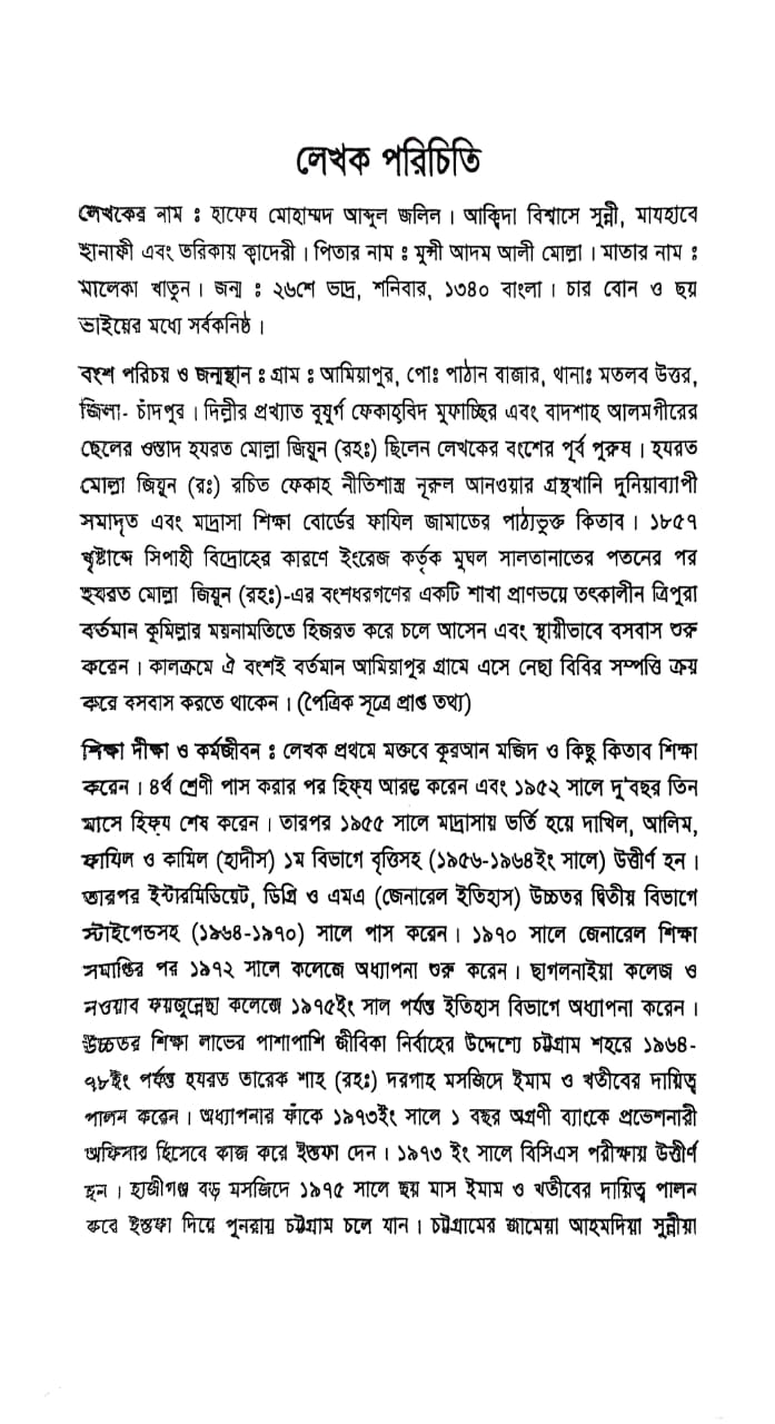 লেখকের নাম : হাফেয মোহাম্মদ আব্দুল জলিল । আকিদা বিশ্বাসে সুন্নী, মাযহাবে স্থানাফী এবং তরিকায় ক্বাদেরী । পিতার নাম : মুন্সী আদম আলী মোল্লা । মাতার নাম : মালেকা খাতুন। জন্ম : ২৬শে ভাদ্র, শনিবার, ১৩৪০ বাংলা। চার বোন ও ছয় ভাইয়ের মধ্যে সর্বকনিষ্ঠ