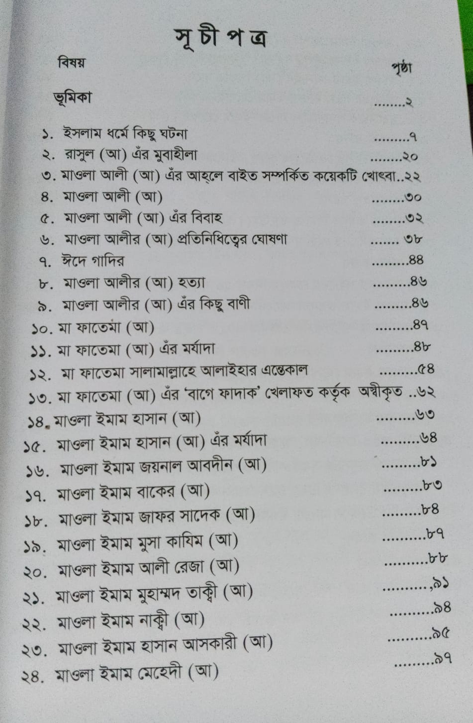 নিকট আনুগত্য করতে পারেন না। তাই মাওলা হোসাইন (আ) ইয়াজিদকে খলিফা হিসেবে স্বীকৃতি দেন নাই। বরং নিজের জীবনকে উৎসর্গ করেছেন। কারবালার ঘটনা ছিল সত্য এবং মিথ্যার লড়াই যা বর্তমানেও অব্যাহত আছে। মুসলিম বিশ্বে প্রধানত দু'টি পথ রয়েছে-একটি হল, আহলে বাইতগণ ও তাঁদের নীতি আদর্শ অপরটি হল, খলিফাগণ এবং তাদের নীতি আদর্শ। মাওলা হোসাইন (আ) এঁর আদর্শের কোন মুসলমান ইয়াজিদি আদর্শের নিকট আনুগত্য করতে পারেন না। আহ্লে বাইত ও পাক পাঞ্জাতন সদস্য মাওলা হোসাইন (আ) এঁর আদর্শই ধর্ম এবং ইসলাম। ইয়াজিদি ধর্ম এবং আদর্শ কখনও মুসলমানদের সঠিক পথ ও হেদায়েত দিতে পারে না। এই গ্রন্থে সত্য ও ন্যায়ের প্রতীক মাওলা হোসাইন (আ) এঁর জীবনী এবং বস্তুবাদী ক্ষমতালোভী লম্পট ইয়াজিদের বিষয় নিয়ে আলোচনা রয়েছে। তারপর মা জয়নবের (আ) ভাষণ ও ইমাম হোসাইন (আ) এঁর একটি ভাষণ বর্ণনা করা হয়েছে। সত্য ও সঠিক পথ খুঁজে পেতে সত্য সন্ধানী মানুষের জন্য এই গ্রন্থটি অত্যন্ত গুরুত্বপূর্ণ। অত্র গ্রন্থটি নতুন আঙ্গীকে আরও বর্ধিত আকারে পুনর্মুদ্রণ করা হল। সকলেই সত্য সুন্দর ও সুপথের প্রতীক হউক এই কামনা করি।